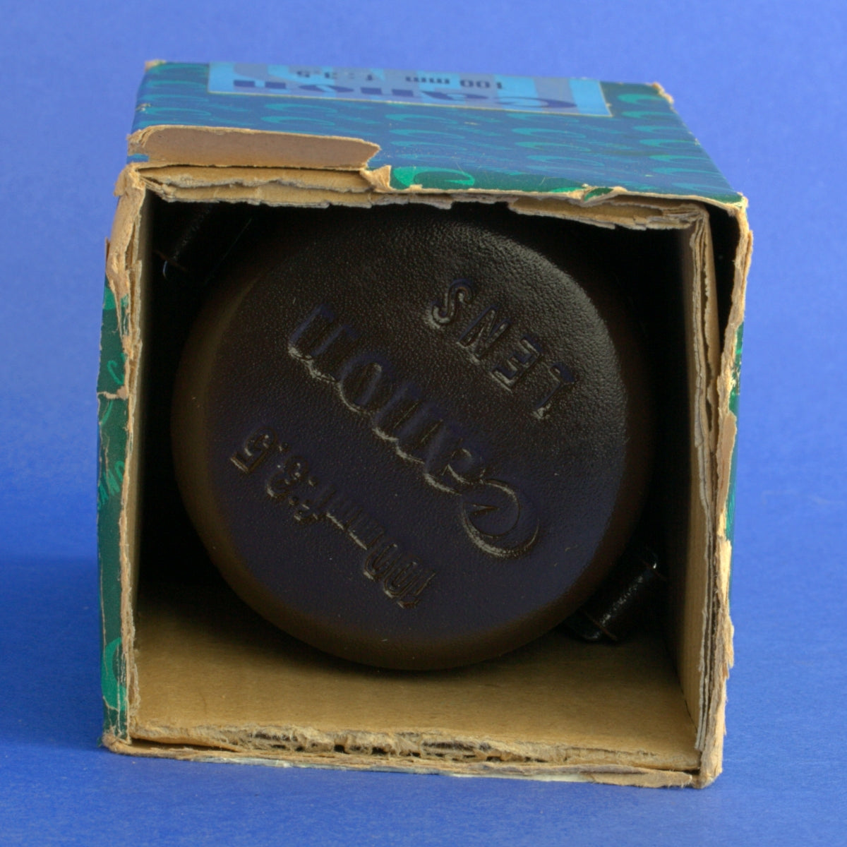 The lens is in beautiful cosmetic condition but has haze or some other coating imperfection in the rear element. The box shows more wear and is missing one of the two small sides. Aperture and focus rings move smoothly.