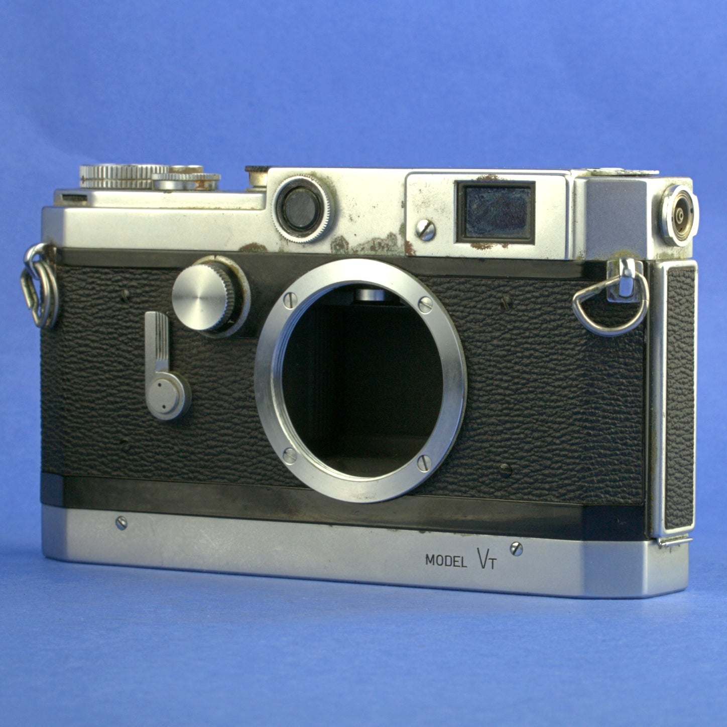 It shows heavy wear and areas with corrosion. The rangefinder doesn’t work. Shutter fires and film advances but the slow speeds are sluggish. Frame counter and self timer work.