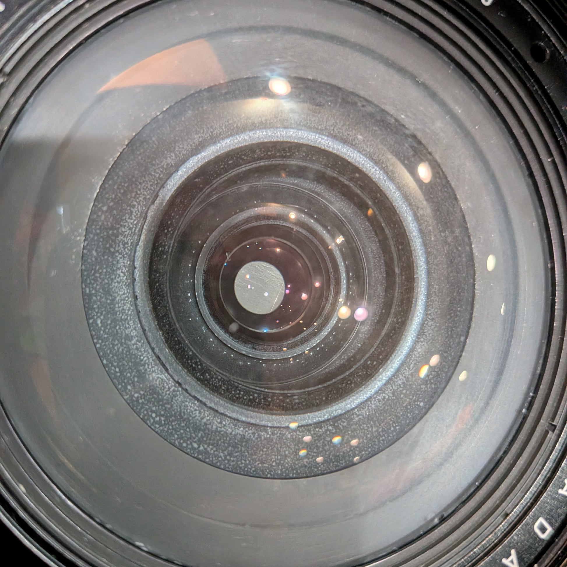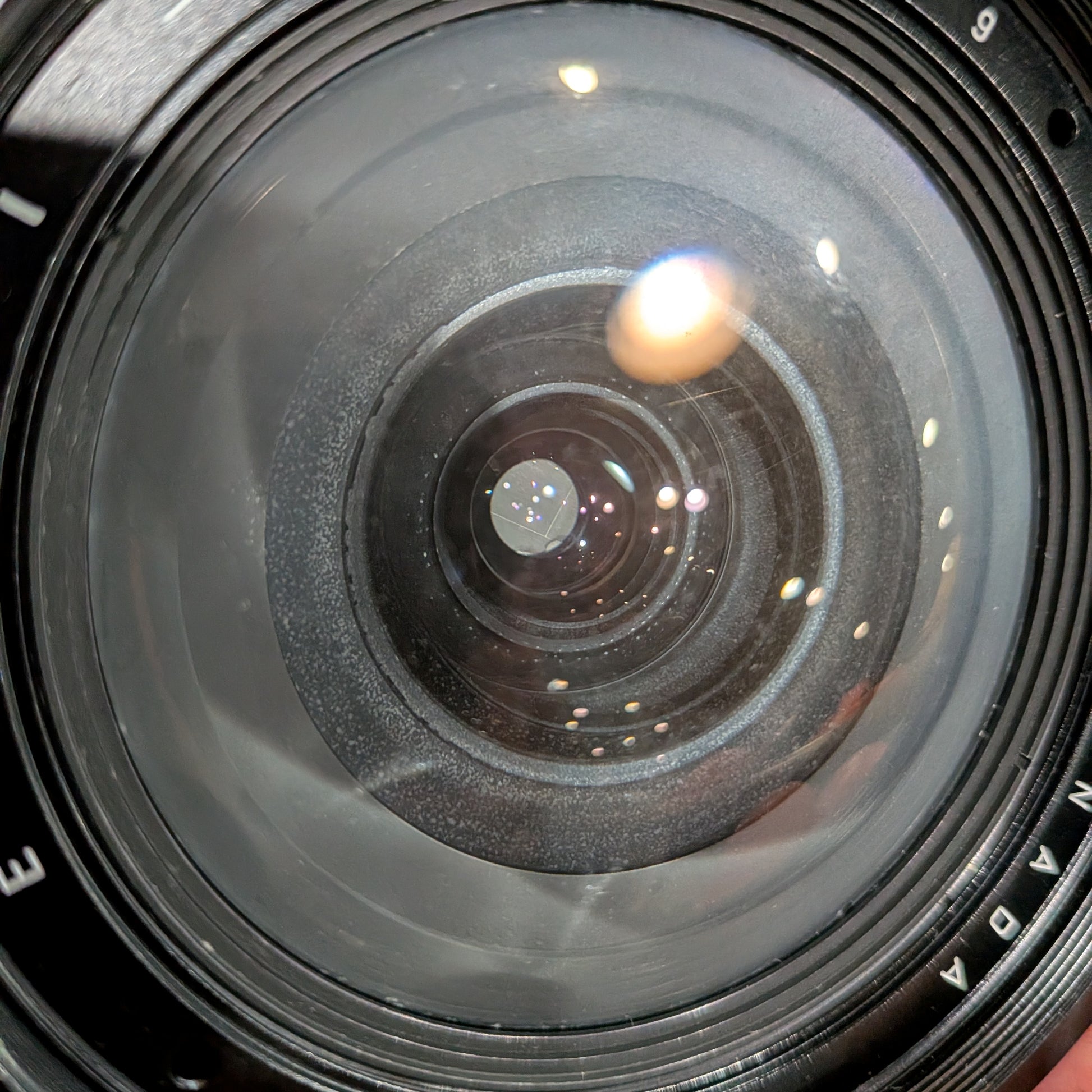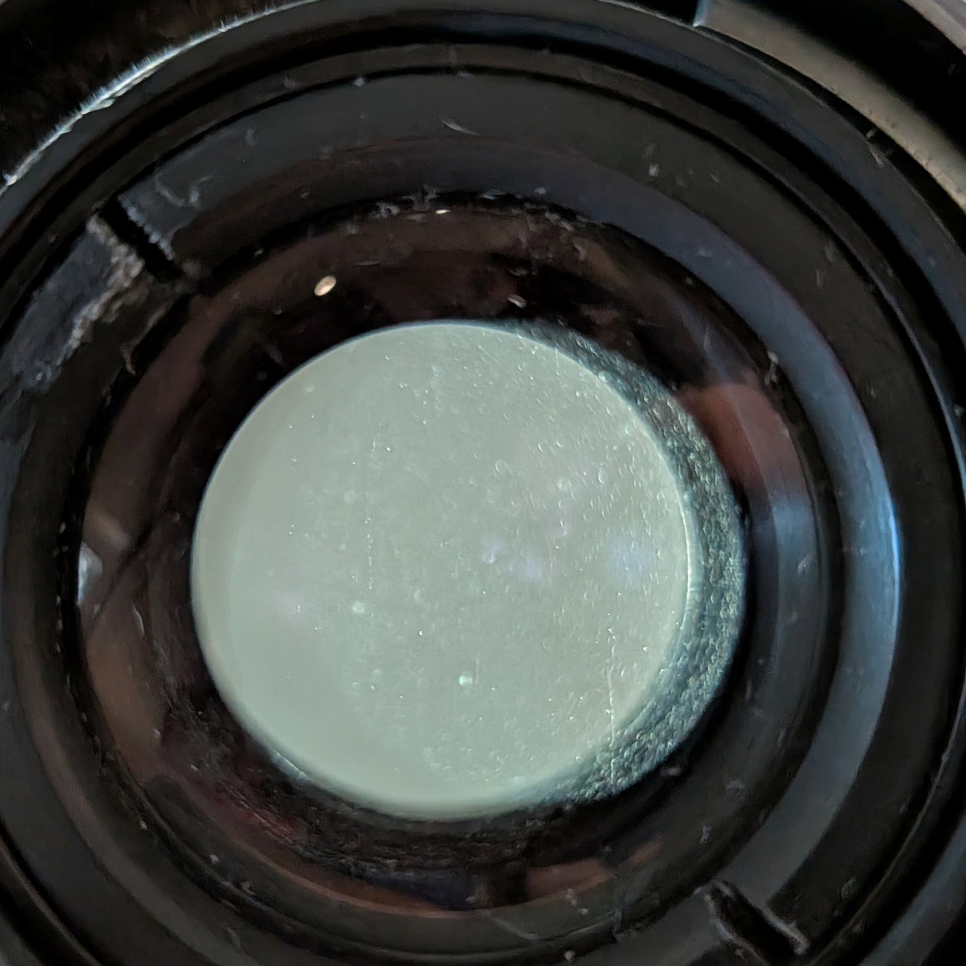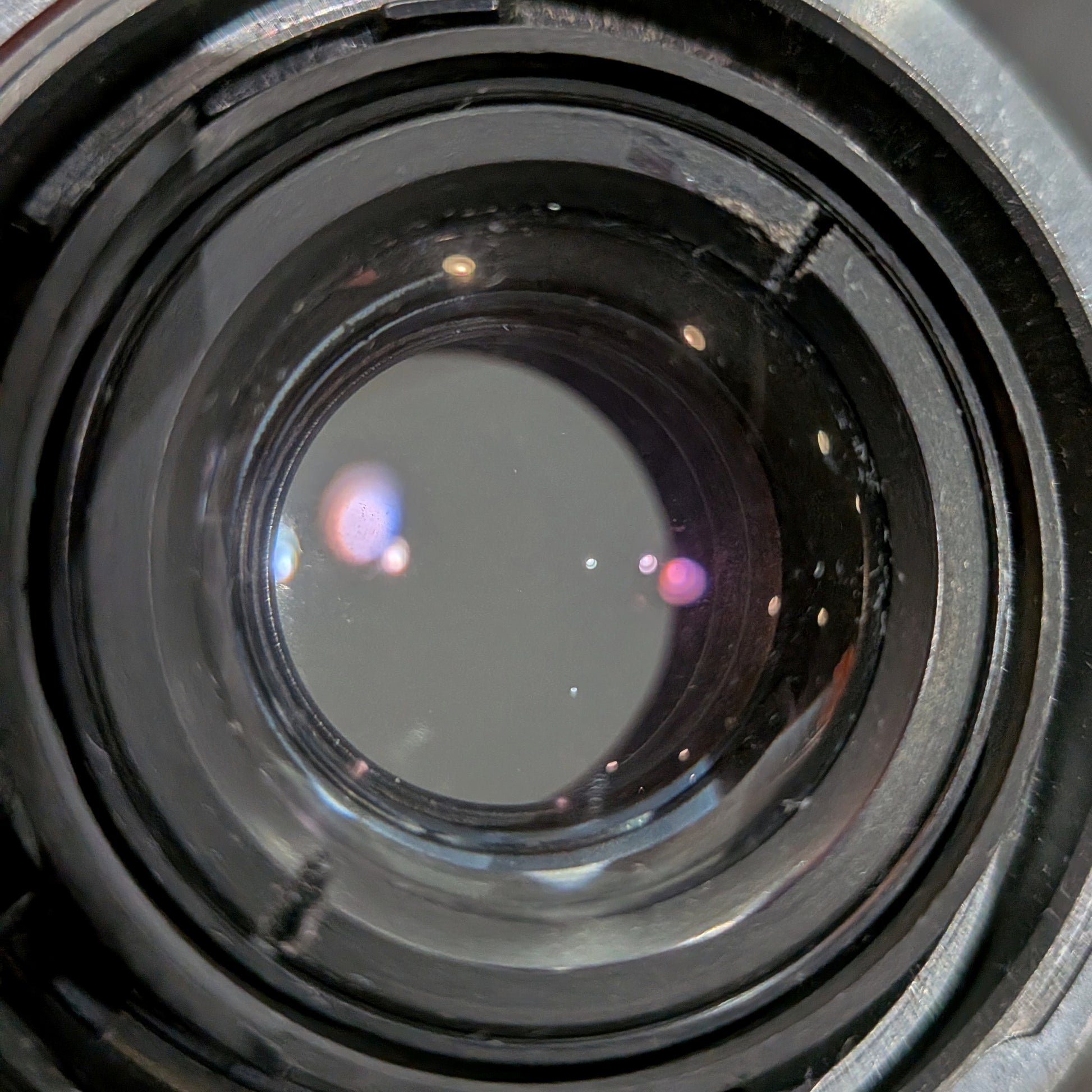 It shows signs of use. The lens is cloudy inside and there are a few cleaning marks on the front element. Aperture and focus rings move smoothly.