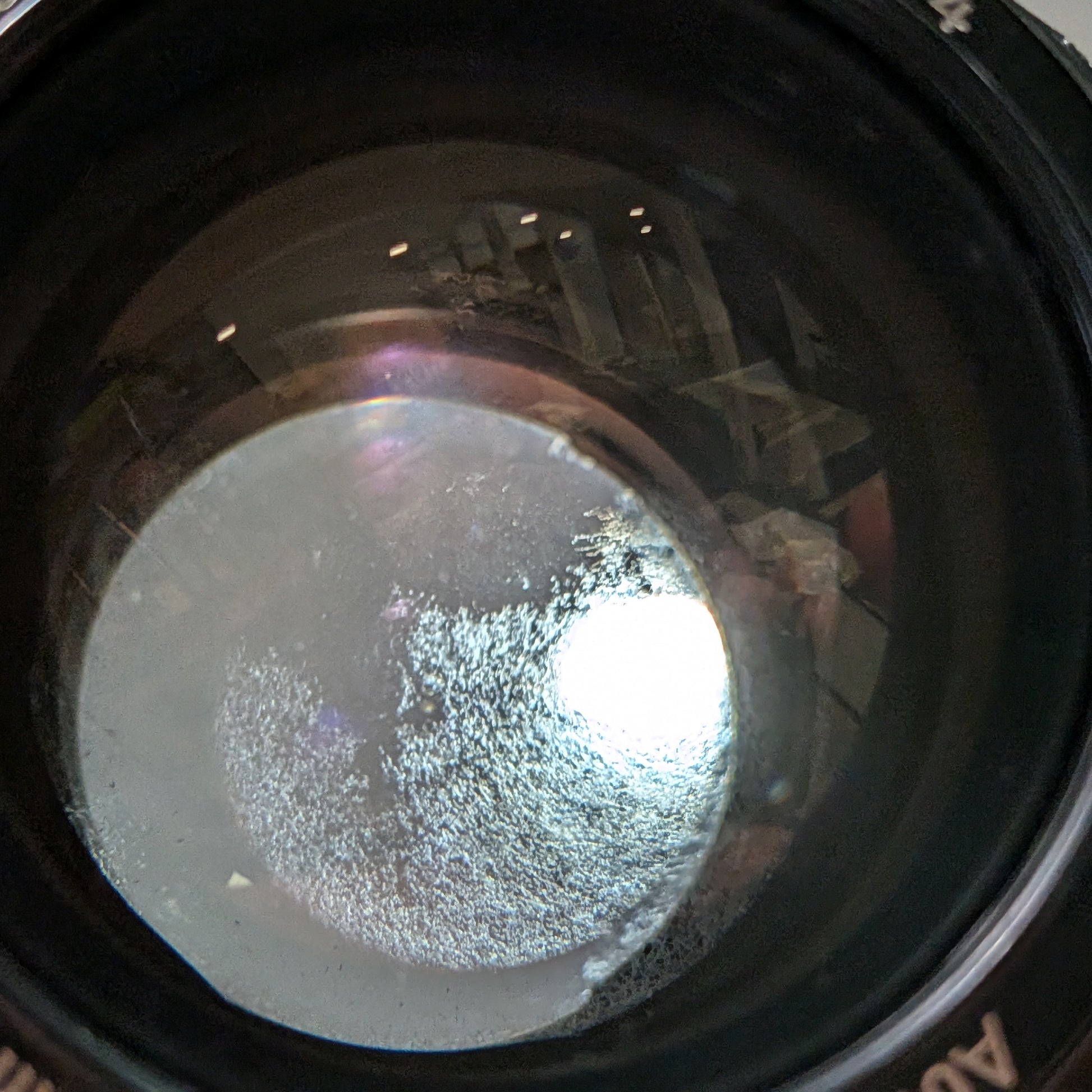 It shows signs of use. The focus ring doesn’t turn. The lens has fungus inside. Aperture ring moves smoothly. Diaphragm operates properly.